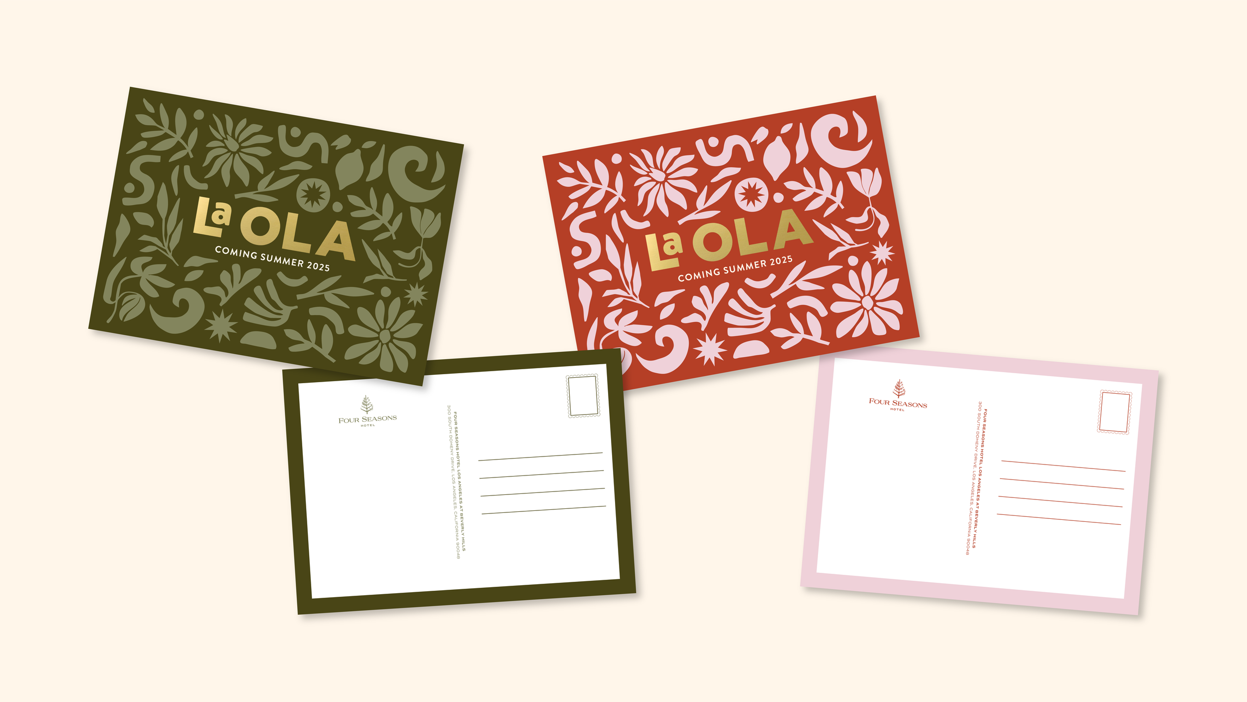 La Ola is a vibrant and bold rooftop restaurant that infuses coastal Mexican cuisine with the heart of Los Angeles. Located at the Four Seasons Hotel Los Angeles at Beverly Hills, La Ola is playful and full of color. A comprehensive brand identity was developed for the Four Seasons team, encompassing a logo, color palette, and pattern. A brand ecosystem was created to represent the lively new LA restaurant.